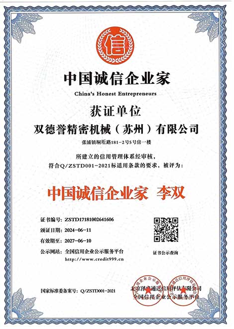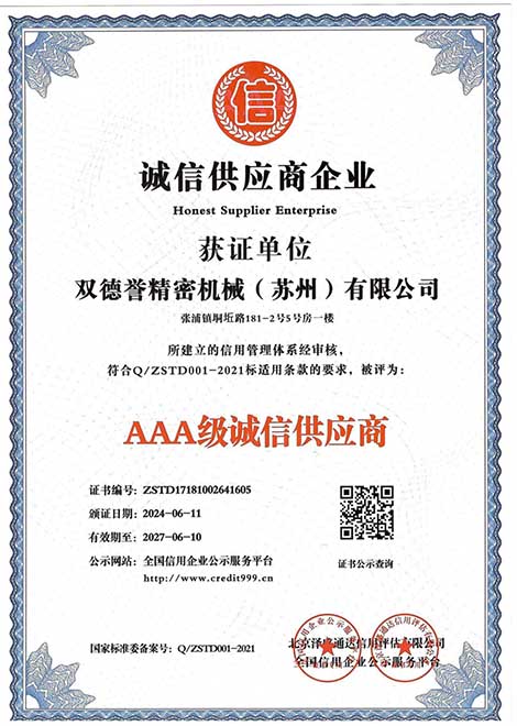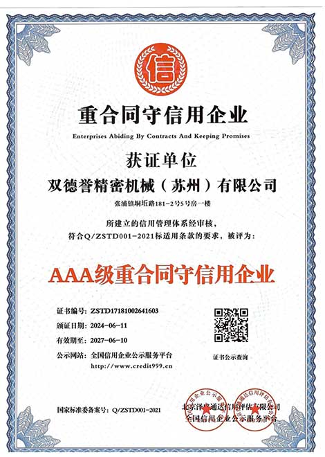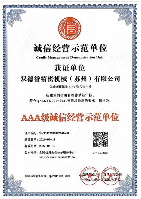 誠信經營示范單位-雙德譽精密機械(蘇州)有限公司